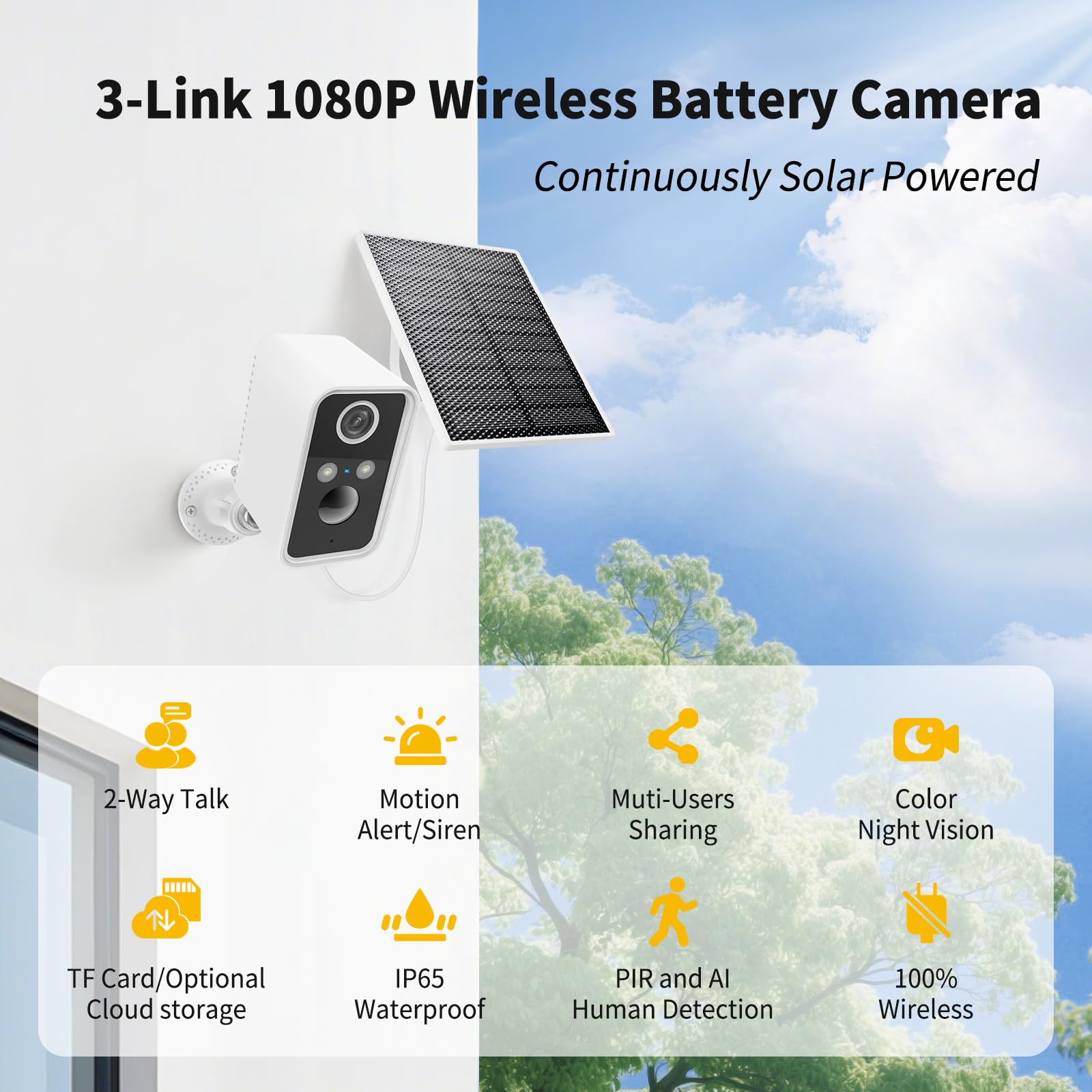 - [Solar Panel] Battery powered with solar panel, this camera stays charged continuously. Enjoy hassle-free, uninterrupted monitoring